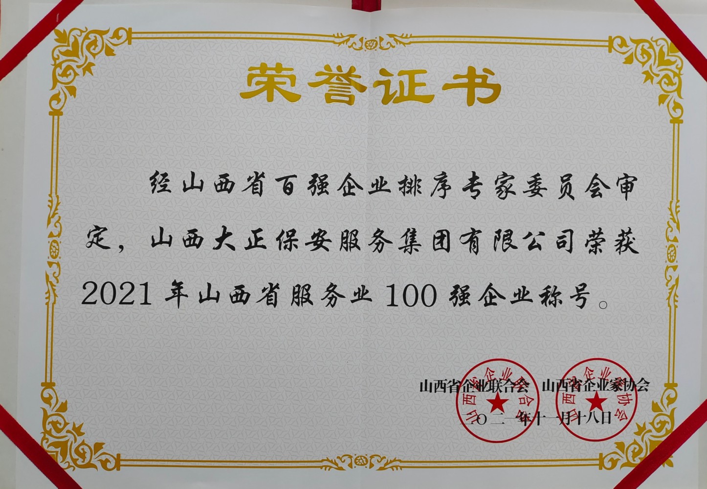 山西大正保安服務(wù)集團有限公司入榜“2021山西企業(yè)服務(wù)業(yè)100強”