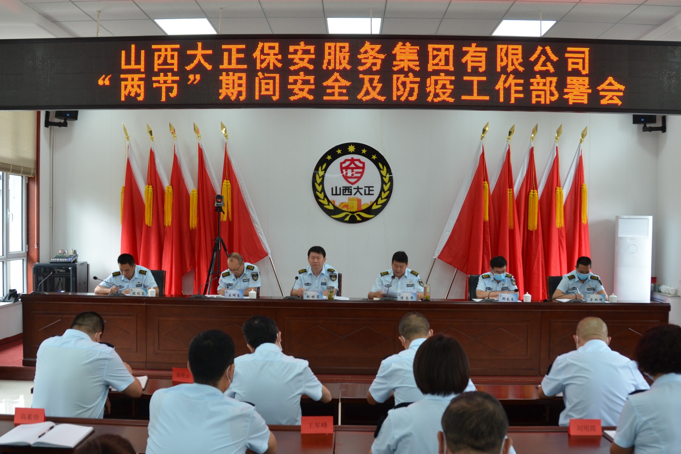 8月29日,山西大正保安服務(wù)集團(tuán)有限公司“兩節(jié)”期間安全及防疫工作部署會(huì)在總部會(huì)議室召開(kāi)。集團(tuán)公司黨委副書(shū)記、總經(jīng)理趙培宏,黨委委員王明生、邢春生,董事呂雙明、張瑞東出席會(huì)議,黨委副書(shū)記、副總經(jīng)理陳志平主持會(huì)議。集團(tuán)公司領(lǐng)導(dǎo)及機(jī)關(guān)各部、各子(分)公司管理人員60余人參會(huì)。