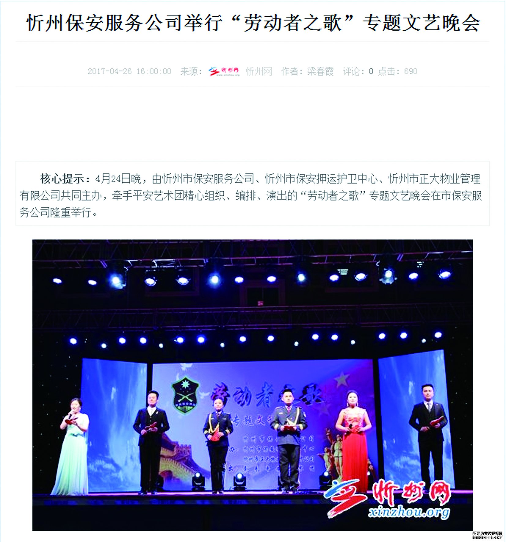 值“五一”國(guó)際勞動(dòng)節(jié)、“五四”青年節(jié)來(lái)臨之際,我公司成功舉辦“慶五一·迎五四”系列文體活動(dòng)。在公司西區(qū)大院舉行“勞動(dòng)者之歌”專題文藝晚會(huì)。舉辦這次活動(dòng)為進(jìn)一步豐富員工文化生活、促進(jìn)溝通交流、增強(qiáng)團(tuán)隊(duì)凝聚力,提高廣大員工的歸屬感和主人翁意識(shí),打造和諧共贏的企業(yè)文化,樹(shù)立企業(yè)良好的社會(huì)形象。向長(zhǎng)期以來(lái)關(guān)心、支持公司事業(yè)發(fā)展的社會(huì)各界人士表示衷心的感謝。節(jié)目?jī)?nèi)容包括舞蹈、配樂(lè)詩(shī)朗誦、制式服裝秀、歌曲、小品、曲藝、戲曲等。異彩紛呈的節(jié)目博得觀眾陣陣掌聲,吸引了眾多市民駐足欣賞。
