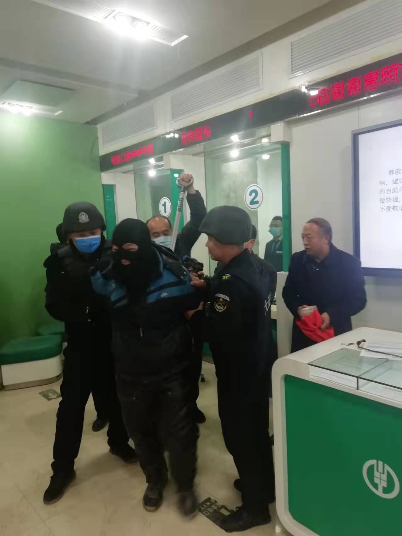 防搶劫演練在農(nóng)行網(wǎng)點(diǎn)按計(jì)劃開展,押運(yùn)人員在“歹徒”搶劫時,臨危不懼,勇敢上前與之搏斗。最終,在大家的共同努力下,制服了“歹徒”。