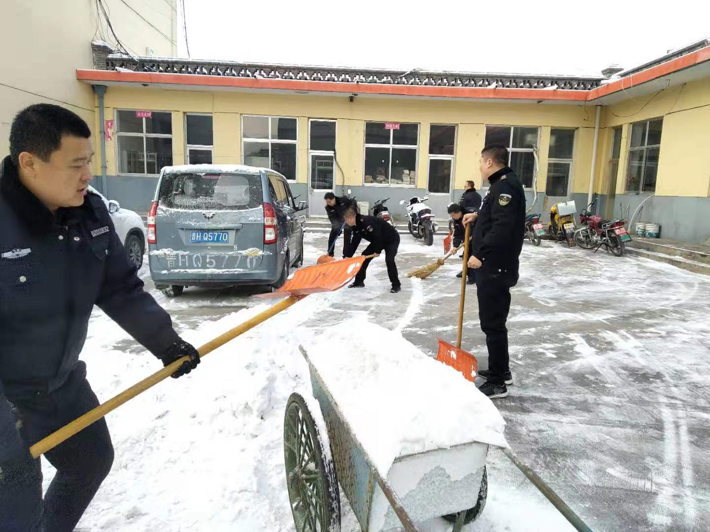 30日一大早,中隊組織隊員積極投身到掃雪行動中。雖然室外氣溫很低,許多人的手和臉也被凍得通紅,然而,這一切絲毫沒有影響大家的勞動熱情和效率。隊員們團結協(xié)作、井然有序,揮舞著鐵鍬和笤帚,鏟的鏟、掃的掃,干得熱火朝天,形成了一道美麗的風景線!經(jīng)過大家的兩個多小時的努力,中隊主要入口、主干道等處積雪被全部鏟除、掃凈,確保了中隊道路通暢,為中隊安全生產(chǎn)和隊員出行掃除了障礙。
